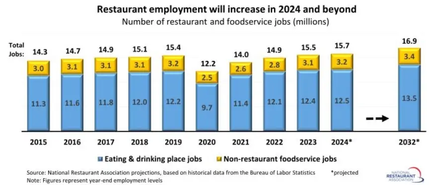 In the course of the subsequent a number of years, restaurant and foodservice employment will proceed to rise at a reasonable fee. Between 2024 and 2032, the business is projected so as to add 150,000 jobs a yr on common, with complete staffing ranges reaching 16.9 million by 2032.