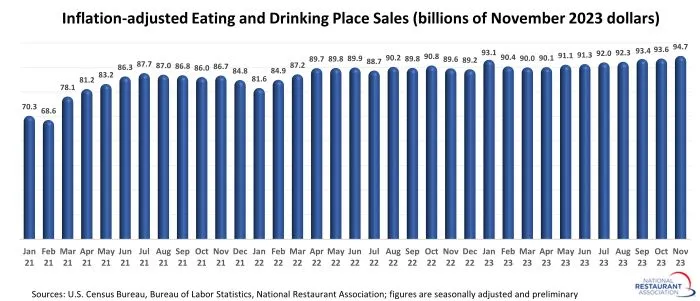 Consuming and ingesting locations* registered whole gross sales of $94.7 billion on a seasonally adjusted foundation in November, based on preliminary information from the U.S. Census Bureau. That was up a stable 1.6% from October’s upward-revised quantity of $93.2 and represented the ninth consecutive month of gross sales progress.