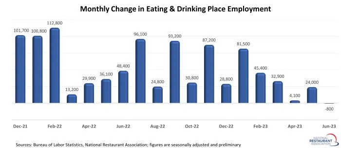 Consuming and consuming locations* misplaced a internet 800 jobs in June on a seasonally-adjusted foundation. That adopted 29 consecutive months of employment good points a interval throughout which the business added greater than 2.5 million jobs.