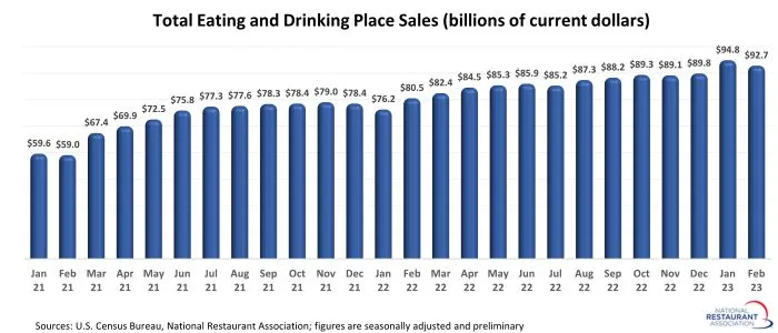 Taken collectively, complete consuming and ingesting place gross sales in January and February have been greater than 19% above the primary two months of 2022.
