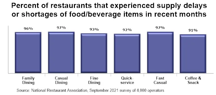The restaurant business is not being spared from the array of provide chain points which can be at present impacting many sectors throughout the economic system. In a September 2021 survey fielded by the Affiliation, 95% of operators stated their restaurant skilled provide delays or shortages of key meals or beverage objects in latest months.