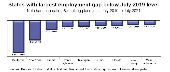 As of July 2021, California had 244,500 fewer consuming and consuming place jobs than it did in July 2019. Restaurant employment ranges have been additionally effectively beneath July 2019 readings in New York (-151,800), Illinois (-72,900), Pennsylvania (-51,400) and Michigan (-50,100).