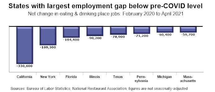 California has 330,600 fewer consuming and ingesting place jobs than it had in February 2020. Restaurant employment ranges are additionally nicely under pre-pandemic readings in New York (-169,300), Florida (-104,400), Illinois (-90,200) and Texas (-78,900).