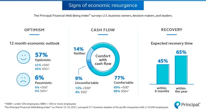 Whereas many small and medium-sized companies reported critical considerations over their long-term well being in 2020, optimism is on the rise in line with the latest pulse of the Principal Monetary Nicely-Being IndexSM, which surveyed greater than U.S. 500 employers2. Solely 39% of employers stated they had been optimistic about their enterprise prospects in November of 2020. Nonetheless, widespread vaccine distribution within the U.S. and indicators of financial resurgence is altering sentiments. In line with the survey, 45% of respondents count on to completely recuperate from the impacts of COVID-19 over the following six months and 65%3 estimate inside a yr.
