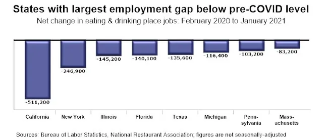 New York (-25,300), Texas (-15,900), Georgia (-9,800), South Carolina (-9,600) and Massachusetts (-8,500) additionally registered sizable restaurant job losses in January.