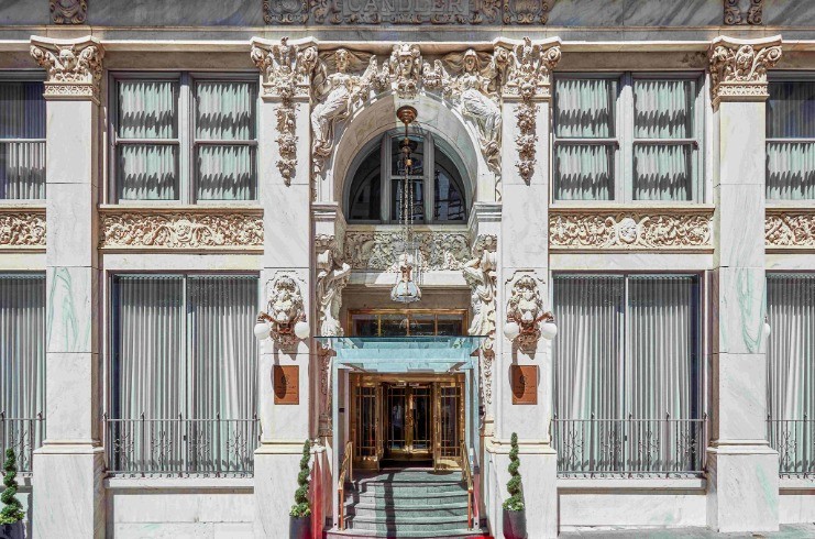 Thornhill Corporations accomplished the transformation of the property in 2019, changing the workplace constructing right into a luxurious resort whereas preserving authentic architectural options, together with the marble foyer with genuine Tiffany rose home windows, mosaic flooring, and terra cotta exterior detailing.