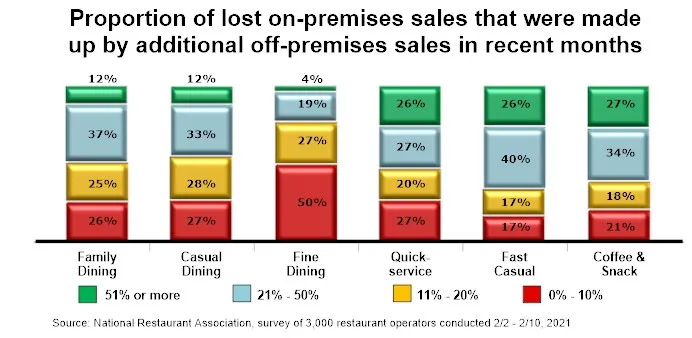 Within the household eating and informal eating segments, simply over one-half of operators say their further off-premises gross sales made up lower than 20% of their misplaced on-premises enterprise.