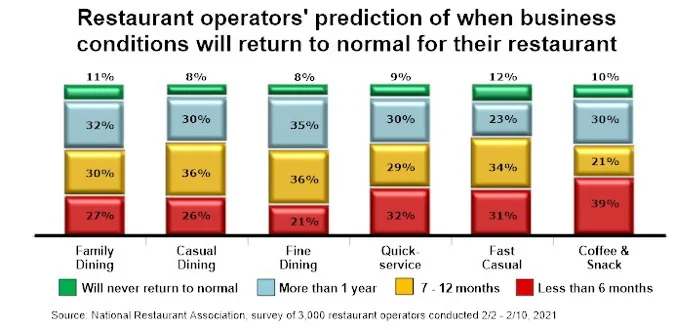 For his or her half, most restaurant operators don’t anticipate a fast return to a traditional enterprise surroundings, in keeping with a Nationwide Restaurant Affiliation survey carried out February 2-10, 2021.