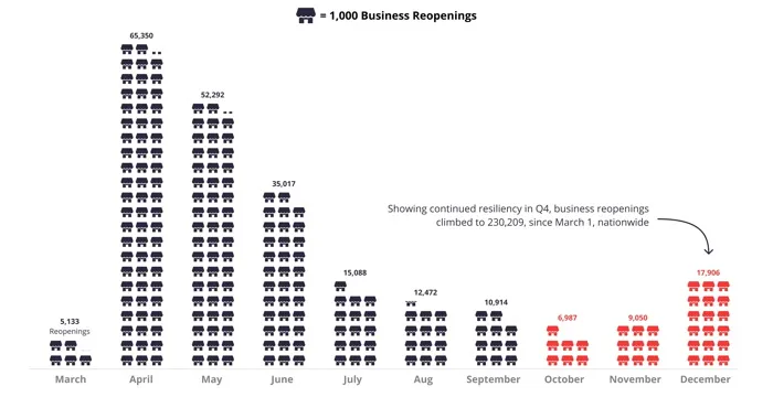 Information from Yelps third quarter YEA report discovered 210,000 reopenings occurred nationwide, as of Sept. 30. In a present of continued resiliency, regardless of elevated COVID-19 instances within the fourth quarter, the entire climbed to 230,209 nationwide reopenings between March 1 and Dec. 31. Reopenings slowed in October, however elevated once more in November and particularly December, coinciding with the approval of a number of COVID-19 vaccines by the FDA.