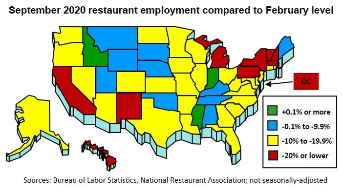 Total, restaurant employment in 47 states and the District of Columbia remained under February’s pre-coronavirus degree. In Hawaii, there have been 46% fewer consuming and consuming locations jobs in September than there have been in February. Restaurant employment in Vermont and the District of Columbia was nonetheless down greater than 30% from February’s ranges.