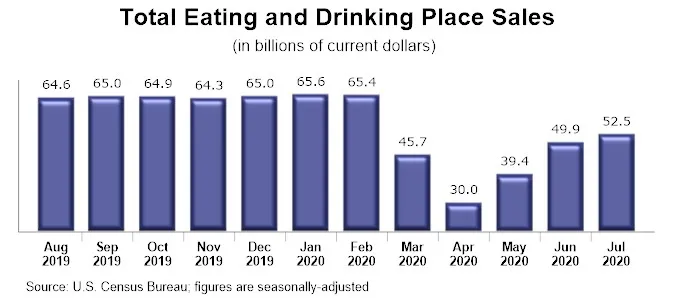 To make sure, client spending in eating places continues to development in a optimistic course, regardless of the entire uncertainty surrounding the virus and the economic system. Nevertheless, July’s gross sales quantity was nonetheless about $13 billion decrease than the pre-coronavirus ranges registered in January and February.