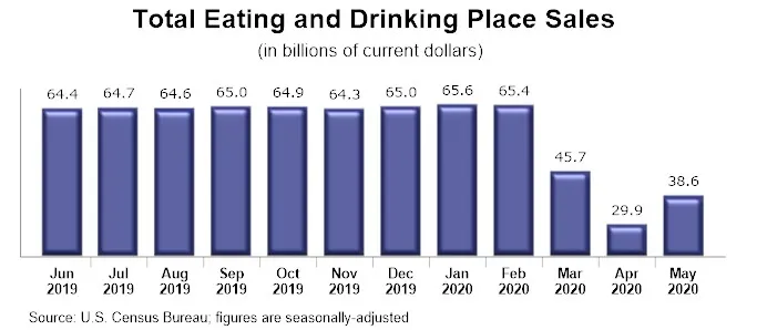 Consuming and consuming locations* registered gross sales of $38.6 billion on a seasonally-adjusted foundation in Might, in line with preliminary data from the U.S. Census Bureau. Whereas that was up almost $9 billion from April, it remained almost $27 billion down from the pre-coronavirus gross sales ranges posted in January and February.